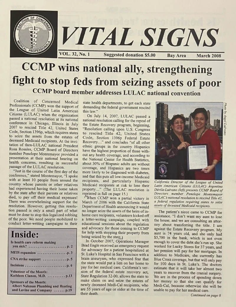 In 2005, California Governor Arnold Schwarzenegger began to aggressively recoup money from estates of deceased Medi-Cal recipients. The Estate Recovery Unit was seizing assets of approximately 4,000 deceased Medi-Cal recipients per year, depriving their heirs of approximately $50 million while, on the other hand, the state provided huge tax breaks to subsidiaries of multinational corporations operating in California. CCMP teamed up with the League of United Latin American Citizens (LULAC) to engage in a letter writing and speaking engagement program. CCMP won partial victories throughout the decade, and in 2017 the state had its ability to seize the assets of deceased Medi-Cal recipients limited under the law.
