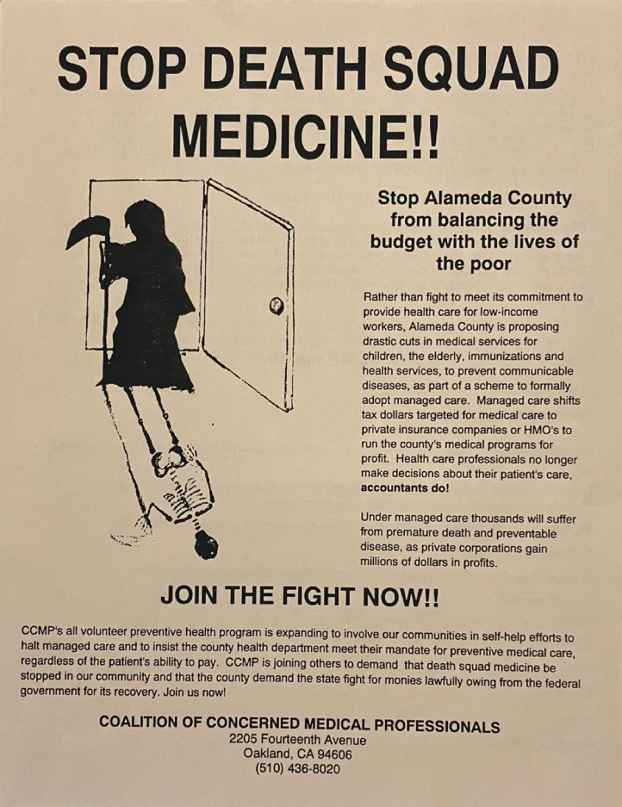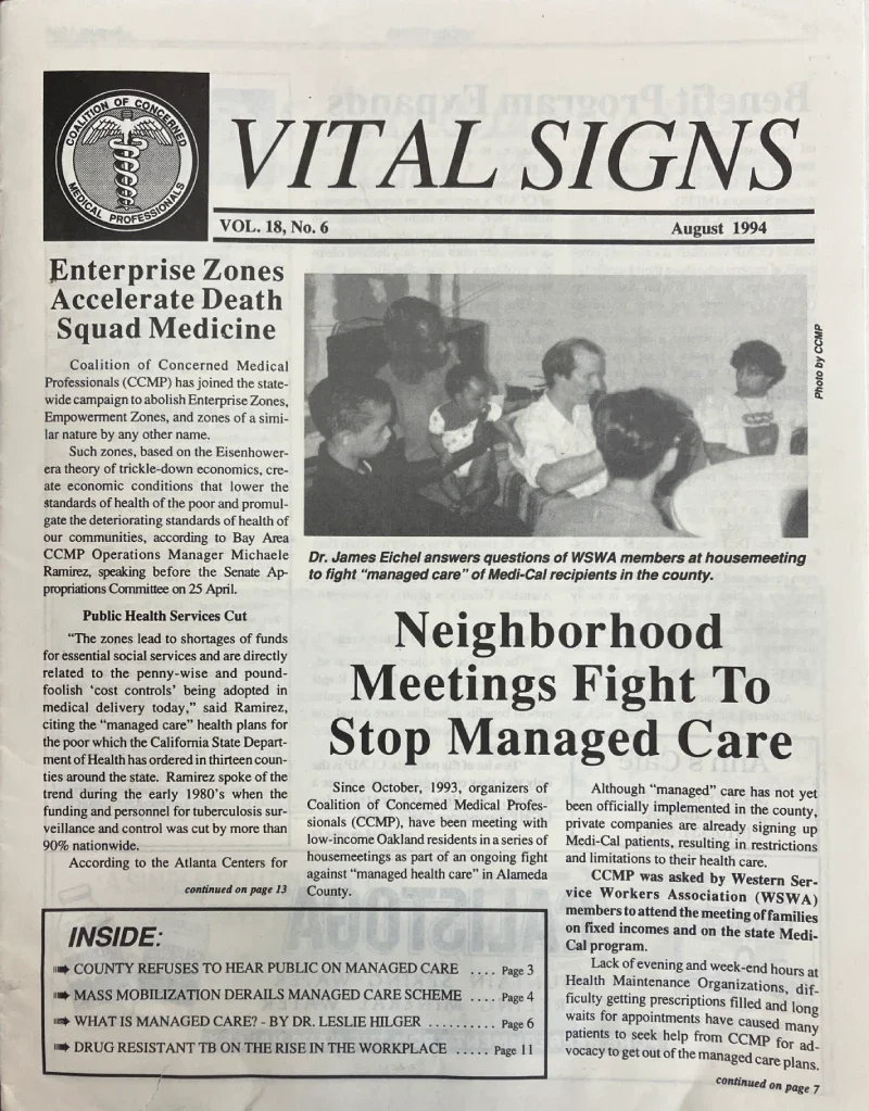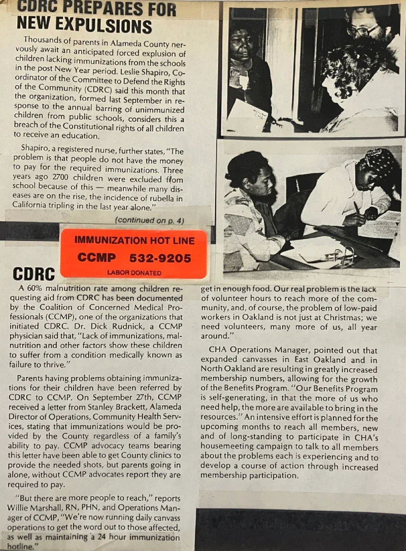 With the passage of Proposition 13 in 1978, a cap was imposed on raising property taxes except when a piece of real estate changed hands, giving major tax breaks to large real estate owners. At the same time, the federal government had reduced its funding for state public health services, which in turn led to the State of California reducing its funding to counties. Both factors led Alameda County to cut back on health services, including immunizations for children. As a result, thousands of children were left unimmunized, with 2,700 banned from attending school and another 9,000 in jeopardy of also being ejected. Through the course of a speaking engagement and massive outreach campaign, CCMP garnered support from physicians and community members to begin well-child sessions to deliver care and vaccines to low-income children as well as coordinate an advocacy campaign to demand the Alameda County Public Health Department take responsibility for immunizing the county’s children. By 1983, the immunizations were restored.